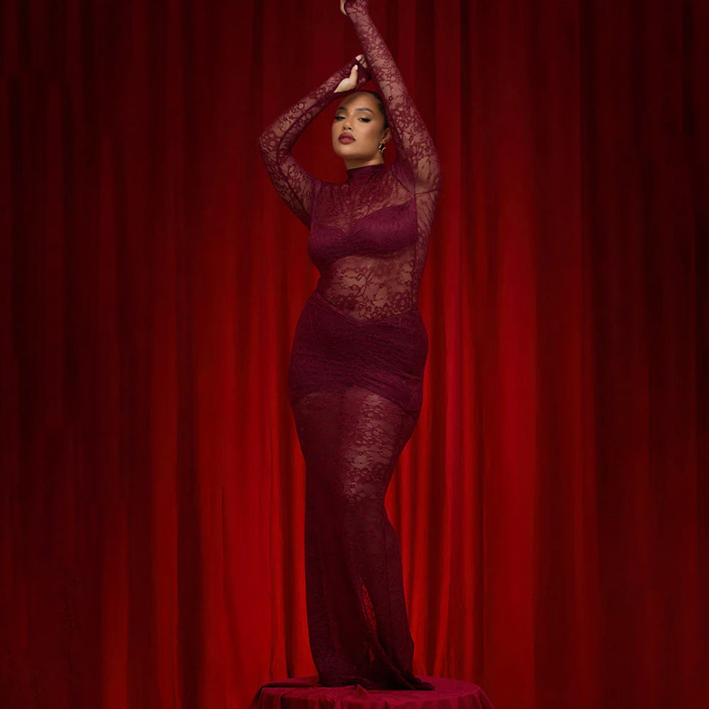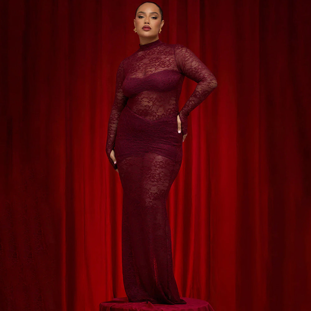 Sexy two-piece round-neck lace see-through stitching tight jumpsuit slit long skirt suit